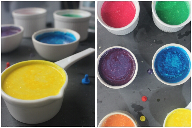 Ensuite, ajoutez dans chacun des récipients les colorants alimentaires (vous trouverez des instructions pour les mélanges des couleurs sur le paquet).